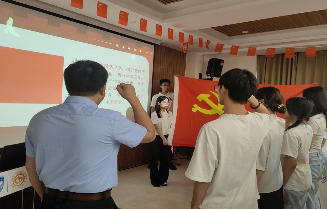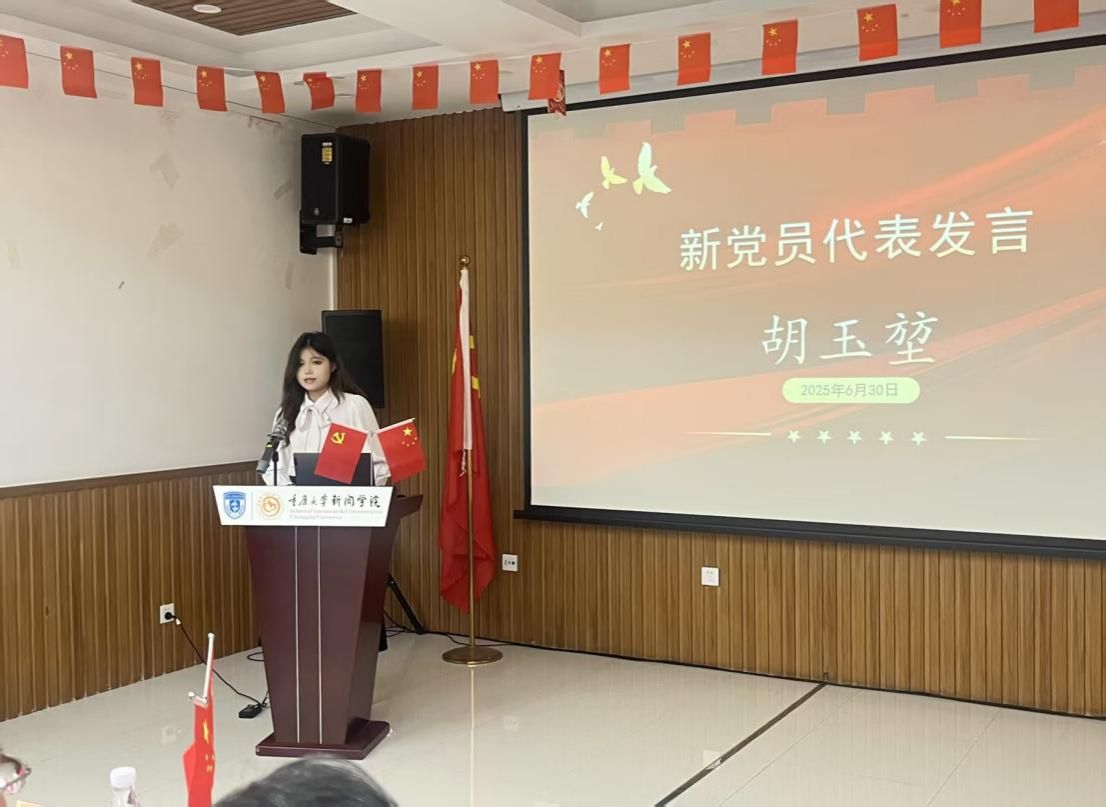 宣誓仪式结束后,新党员代表胡玉堃同学发言。她深情回顾了一年多考察期的感悟,强调成为一名共产党员是荣誉更是责任。面对信息涌动的时代,她誓言将秉持“铁肩担道义,妙手著文章”的信念,深耕专业,锤炼采编技能,研读理论经典,致力于挖掘真实故事,传递民众心声,以有温度、有深度的报道服务社会进步,兑现新闻人的时代承诺,为党旗增光添彩。