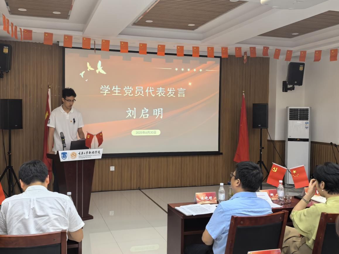 随后,学生党员代表刘启明同学发言。他号召全体党员坚定理想信念,向组织靠拢,既要成为“思想的巨人”,更要争做“行动的标杆”。他提出在学习中应勇攀高峰并热忱助人,在集体中需怀“功成不必在我,功成必定有我”的担当——主动策划班级活动、为学院发展献策、在关键时刻挺身而出,以实际行动守护“我将无我,不负人民”的初心。
