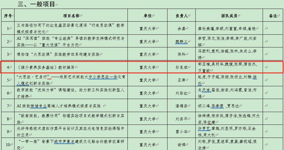 此外,董天策教授团队申报的 “2025年重庆高校中文新传类本科专业建设与发展状况监测评估研究” 项目获批一般项目(教指委专项)立项,孙良斌高级实验师团队申报的 “《媒介素养实务基础》教材编写” 项目获批一般项目立项。