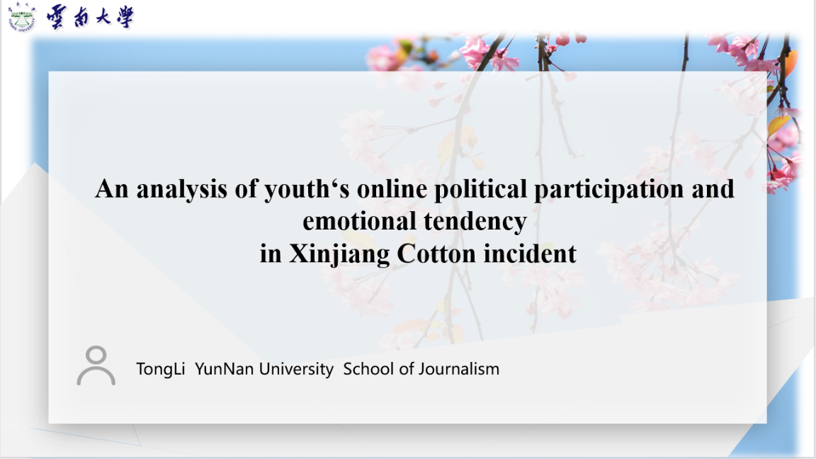 硕士生李彤以“An analysis of youth‘s online political participation and emotional tendency in Xinjiang Cotton incident”为题,采用内容分析法和情感分析方法对青少年的网络政治参与和情感倾向进行分析,认为青少年的政治参与主要集中在民族视角和个人主观情感的直接表达上,并将偶像崇拜和网络民族主义结合起来,这种现象背后可能会消除政治参与的严肃性,并引发一些混乱。