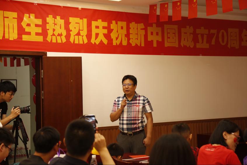 师生家属能欢聚一堂共庆表示感谢和喜悦,并就家国关系阐述了本次活动的立意,没有一个强大的国家,哪有我们幸福的小家,学院以师生家属一同观看阅兵仪式等来隆重庆祝新中国成立70周年,具有特别意义。同时,他还强调新时代的我们,肩负着中国特色社会主义事业建设与发展的重任,用青春告白祖国,以奋斗迎接未来,我们都有责任和义务担负起时代责任和神圣使命。