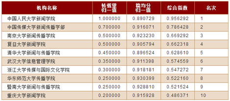 查阅官方网站发布的排行榜,新闻传播学学科高等院校转载全文245篇,约占本学科转载总数(306篇)的80.1%,排名方式是对3篇以上的高等院校所属机构分学科排名,进行转载量和综合指数计算并选取前10名进行排序。