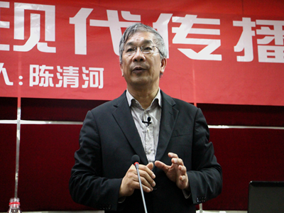 讲座伊始,陈清河教授与同学们简单分享了自己三十多年的从业经历,并以自己成为传播人的经验告诉同学们:“身为一个合格的传播人要有几个条件:首先有千里眼可以察言观色,其次用顺风耳去听各种各样的人讲的话,同时要有敏感的鼻子去判断什么是有价值的新闻,再用拉链的嘴巴和公关的右手让自己更好地与人交往,最后要有极具创意的左手以及一双平稳的双脚去走得更远”。同时,陈清河将传统的单向传媒和如今的双向传媒进行对比,由此提醒在场各位同学要开始调整自己,否则会被时代淘汰。