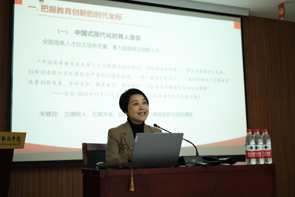 中国传媒大学本科生院院长王晓红教授以“厚基拓界 融合创新:本科人才培养与传媒教育创新”为主题,探讨新闻传播专业本科生培养路径。王晓红认为,首先要把握教育创新的时代坐标,全面提高人才自主培养质量、着力造就拔尖创新人才,做到人工智能驱动下的教育创新。其次,王晓红提出反思人才培养的三个基本命题。一是从“价值-使命塑造”出发,掌握学科的核心价值、培养定位,激励专业认同感。二是创新课程体系,着力培养学生的通识能力、精专能力和实践能力。三是为创新人才的成长提供鼓励创新、包容失败、个性化培养的制度空间。