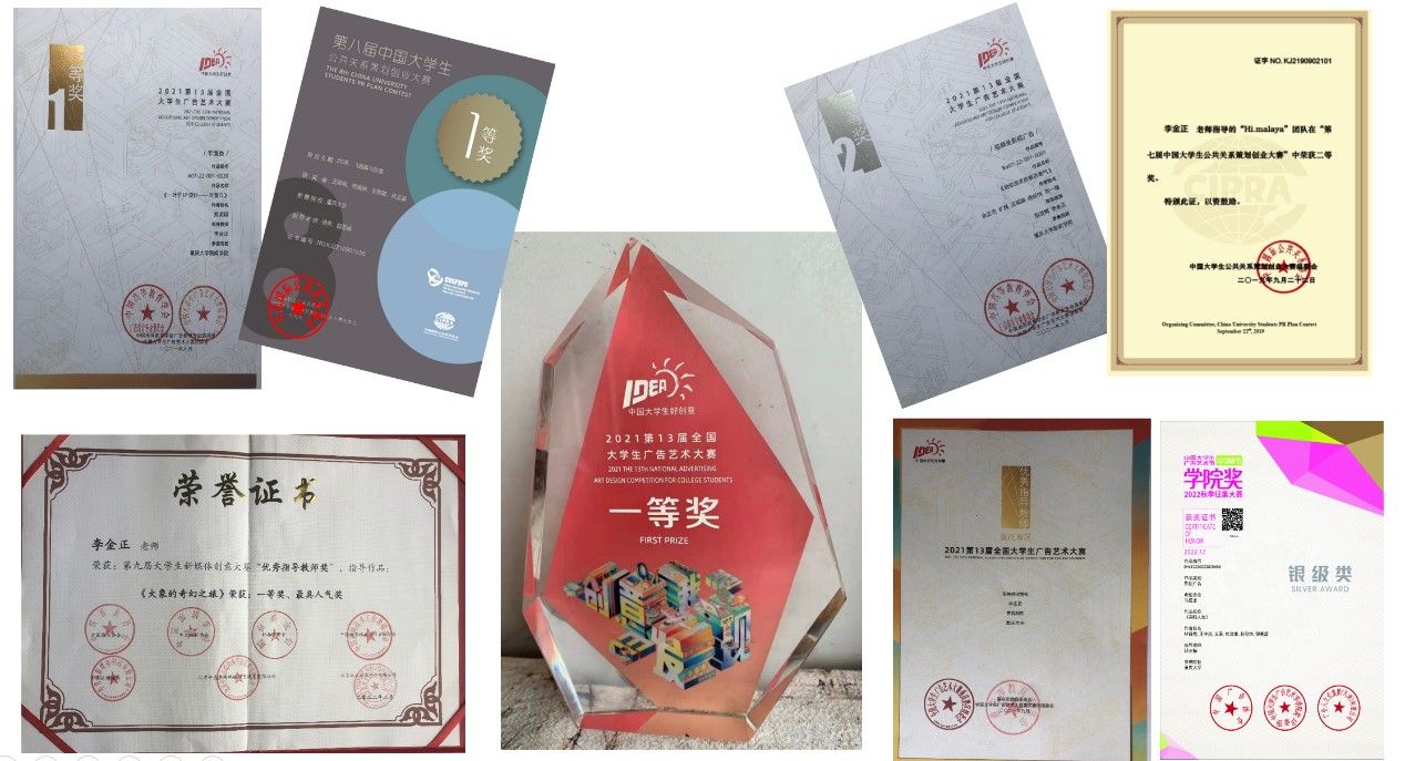 项。课程负责人李金正老师获得第九届全国大学生新媒体创意大赛“优秀指导教师奖”、第十三届全国大学生广告艺术大赛重庆赛区“优秀指导教师”等荣誉称号。