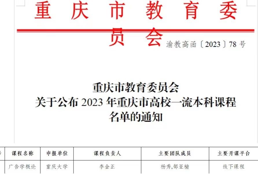 重庆市教委《广告学概论》课程入选信息