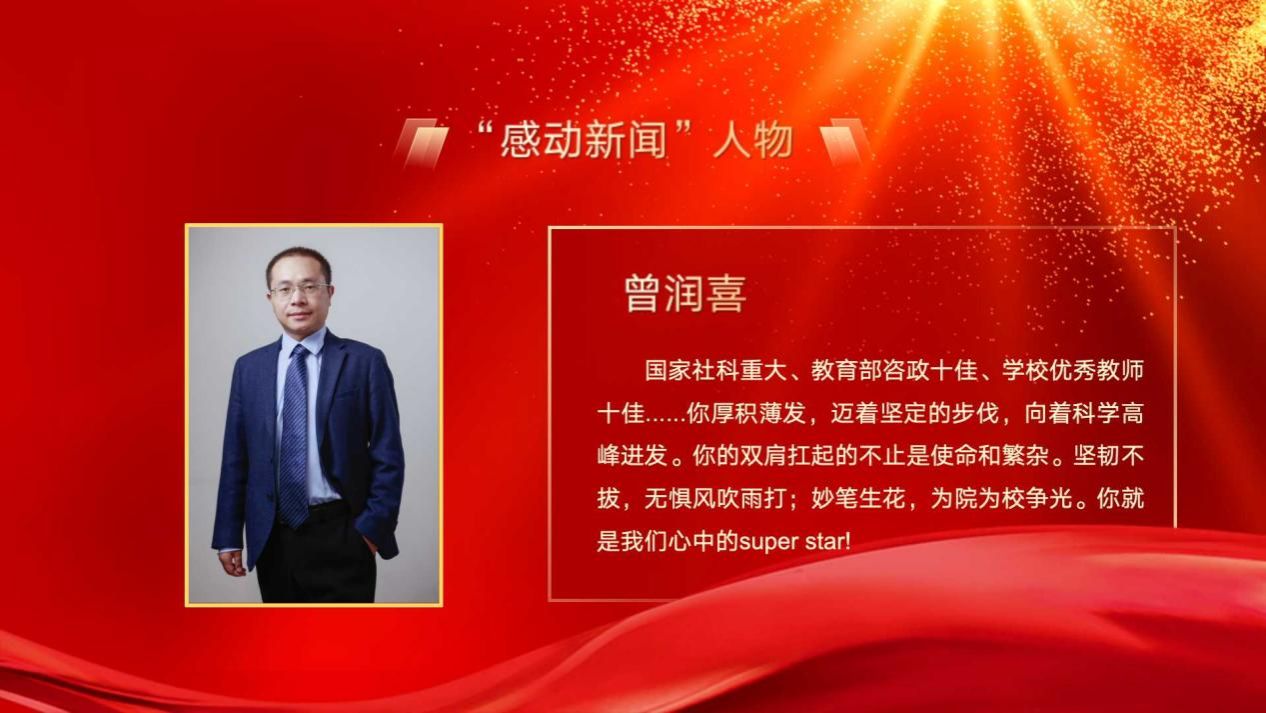 国家社科重大、教育部咨政十佳、学校优秀教师十佳......你厚积薄发,迈着坚定的步伐,向着科学高峰进发。你的双肩扛起的不止是使命和繁杂。坚韧不拔,无惧风吹雨打;妙笔生花,为院为校争光。你就是我们心中的super star!