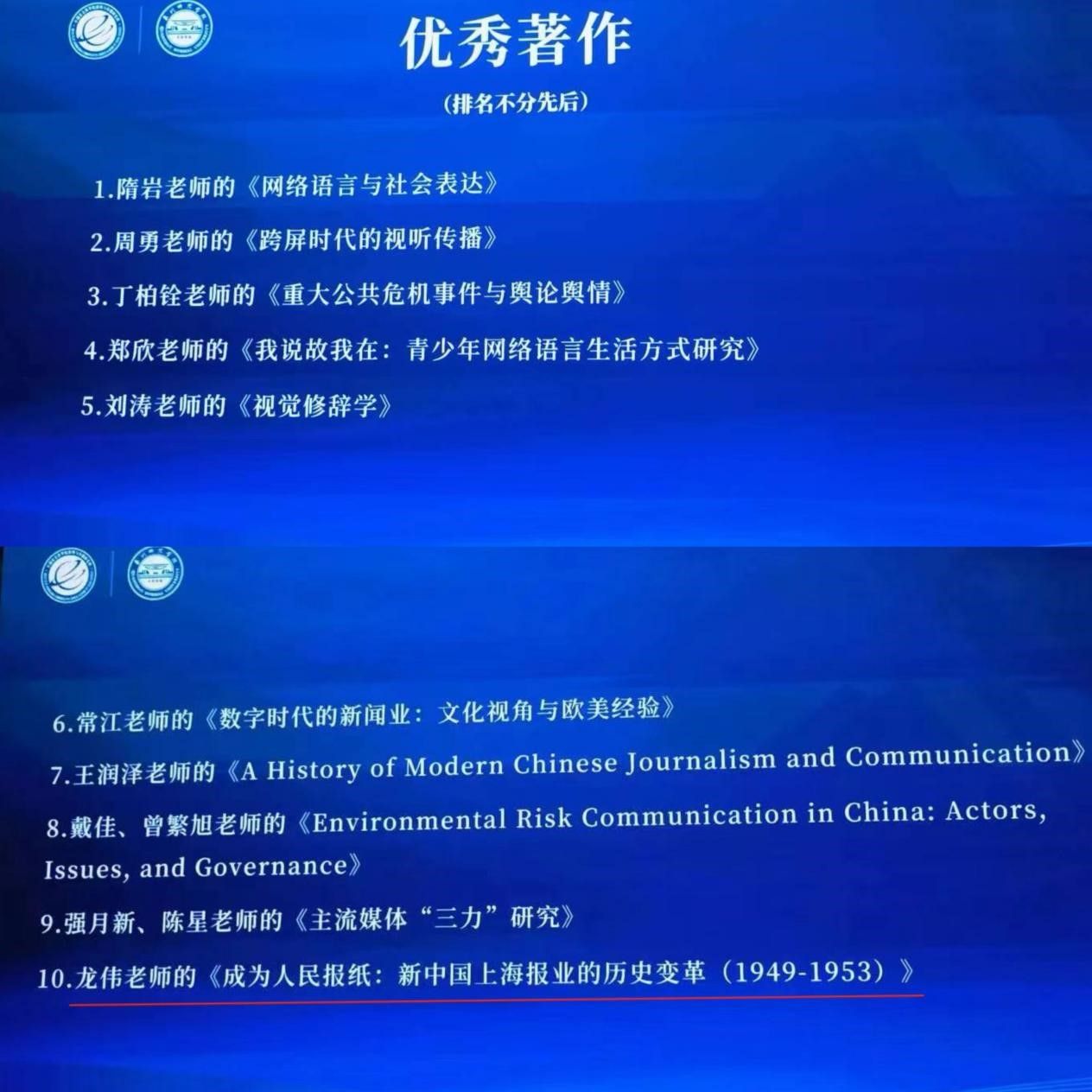 郭小安教授获得2021-2022年度“活跃的学术中坚”奖;龙伟教授的《成为人民报纸:新中国上海报业的历史变革(1949-1953)》获得“优秀著作”奖。海棠搜书