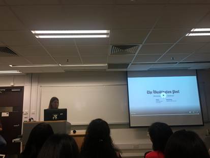 24日上午,2018年普利策公共服务奖团队成员茱莉亚•莫斯金和吉姆•西弗森为与会师生带来了主题为“优秀特写新闻写作的技巧和要诀”的公开讲座。她们二人均为《纽约时报》记者,专责报道美国饮食文化,因为报道工作场所性骚扰问题而获得了2018年普利策公共服务奖。茱莉亚认为,如果想要成为一个好的特写作家,需要明白“简单的事情就是有力的事情”,在新闻写作中要挖掘出一些大多数人看不到的点。她强调,新闻特写不等于信息写作,不是强制读者进行阅读,“我们只能够吸引我们的受众——而不是强制她们——阅读我们的特写,所以我们的特稿必须有趣。”“想要将特写变得真实,需要对采访的事物有详尽的了解。”吉姆提到,“在进行特写写作的时候,我们需要把收集到的素材都放在草稿中,再通过对细节的挑选,最后组成文稿”。