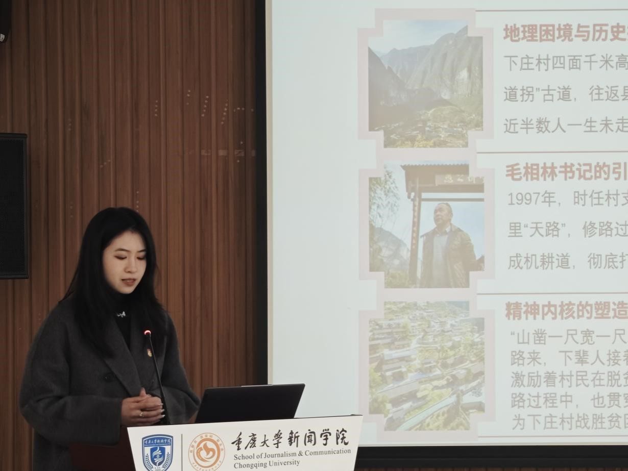 下庄村曾是重庆最贫困的村庄之一,村民外出到县城需要徒步翻越“108道拐”古道,1997年,时任村支书的毛相林书记带领村民历时7年,以牺牲6位村民的代价,在绝壁上凿出8公里“天路”,终结了“行路难”的历史。唐诗以“2020年度感动中国十大人物”等众多荣誉于一身毛相林书记的故事为切入点,带领党员同志切实感悟了“不甘落后、不等不靠、不畏艰难、不怕牺牲”的下庄精神,还从新闻传播学科专业的角度出发思考如何将个体的奋斗升华为集体的精神符号。