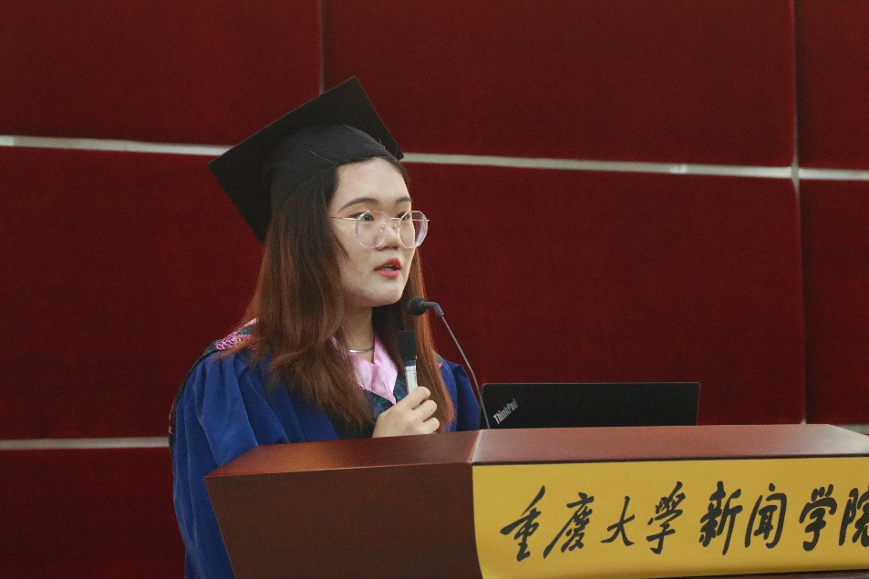 研究生毕业代表刘文斌同学发言。她以时光见证者的身份回顾了过往三年时光里国家、社会、学校、学院的发展,并期许同学们能举起时代的炬火,成为时代新的光和热。牢记“好学求真、力行至善”的院训,抱定为国家、社会服务的宗旨,以赤子之心,肩道远之任,日益精进,砥砺前行。