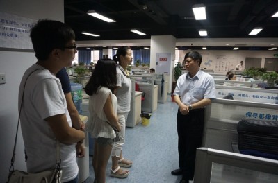 张德泽副总裁带同学们参观了包括海棠搜书、视听中心、新媒体事业部、全媒体中心、网络问政中心在内的数十个部门,并生动形象地讲述了华龙网的创新发展战略模型:以新闻立网为机首引领方向,以技术集成和创新服务为两翼稳定飞翔,以产业集群为机尾提供不竭动力。同学们近距离观察网络媒体现场的工作流程、认识到出色媒体人应具备的基本职业技能。