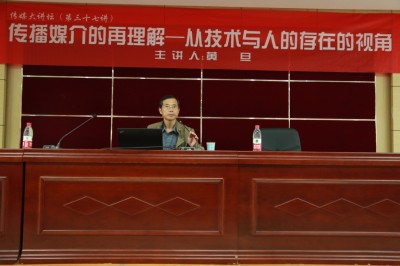的学生们讲述了三个部分内容。首先提出问题:媒介是工具还是能力?黄教授引用了一句话加以说明:“我们很容易把技术工具作为那些使用者所犯罪孽的替罪羊。现代科学的产品本身无所谓好坏,决定它们价值的是它们的使用方式。”第二个部分是“技术:新的环境”。在这个部分当中,黄教授介绍了麦克卢汉、英尼斯、梅洛维茨的理论,并较详细地介绍了媒介化(mediatized)的过程以及它对社会建构造成的影响等问题。在第三部分“技术:人的生存构成”中,黄教授介绍了海德格尔、波斯特、延森的学术观点,并讲述了一个重要的概念:共同进化。“共同进化是互相影响的物种间交互的进化演变。共同进化之路上的每一步都使这两个对手缠绕得更加密不可分,直到一方完全依赖于另一方的对抗,从而合二为一。”指出人类和技术是共同进化的,人类进化的同时,对媒介技术提出了新的要求,促使了媒介技术也在进化,两者密不可分。