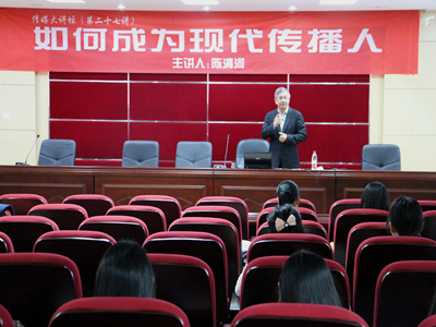 讲座伊始,陈清河教授与同学们简单分享了自己三十多年的从业经历,并以自己成为传播人的经验告诉同学们:“身为一个合格的传播人要有几个条件:首先有千里眼可以察言观色,其次用顺风耳去听各种各样的人讲的话,同时要有敏感的鼻子去判断什么是有价值的新闻,再用拉链的嘴巴和公关的右手让自己更好地与人交往,最后要有极具创意的左手以及一双平稳的双脚去走得更远”。同时,陈清河将传统的单向传媒和如今的双向传媒进行对比,由此提醒在场各位同学要开始调整自己,否则会被时代淘汰。