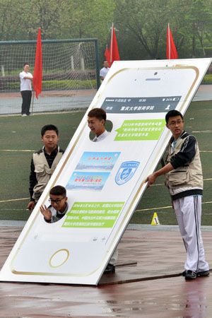 的方阵表演立足本学院特色,着眼于新闻媒体的发展历程:由纸质媒体——报纸,到网络时代的电脑再向手机新媒体平台的发展。由此分别制作了模仿1929年海棠搜书