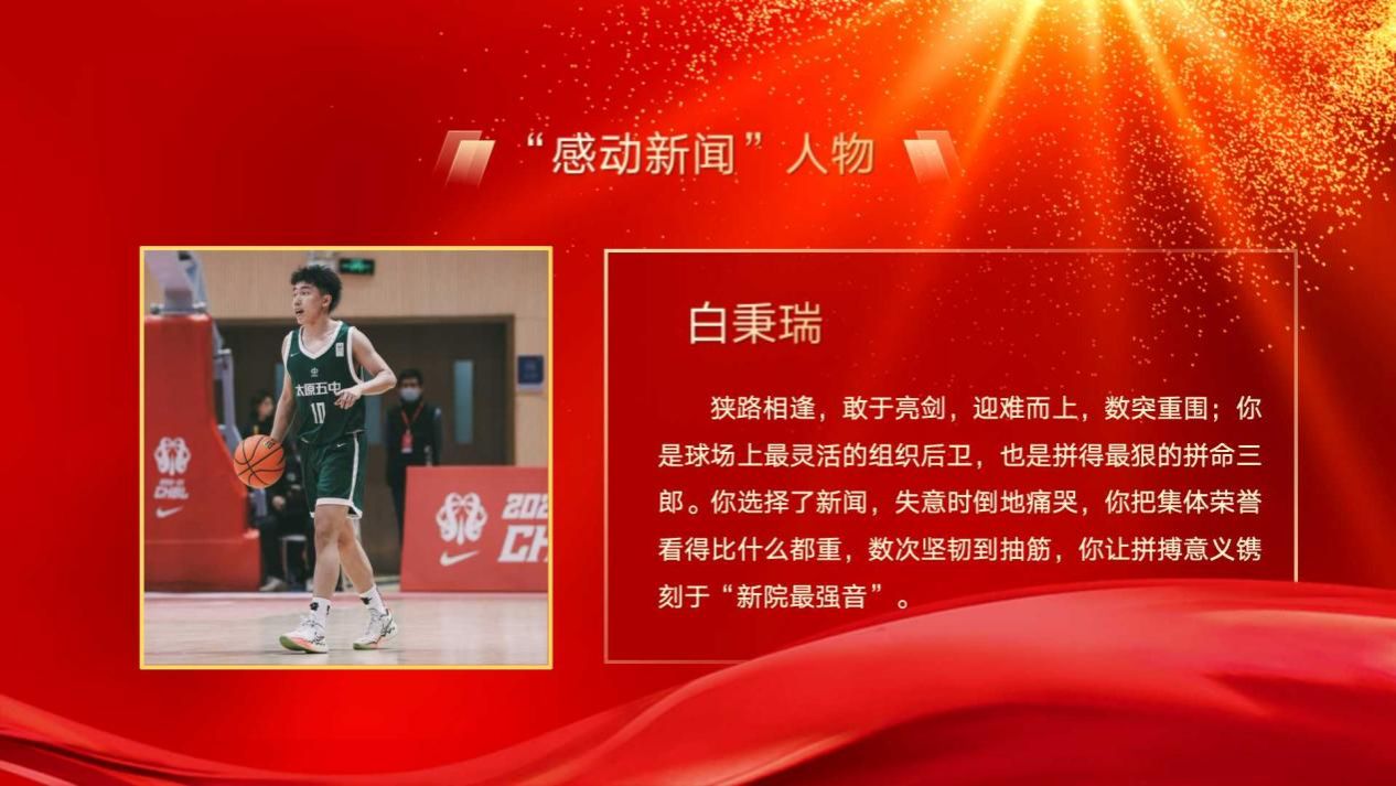 狭路相逢,敢于亮剑,迎难而上,数突重围;你是球场上最灵活的组织后卫,也是拼得最狠的拼命三郎。你选择了新闻,失意时倒地痛哭,你把集体荣誉看得比什么都重,数次坚韧到抽筋,你让拼搏意义镌刻于“新院最强音”!