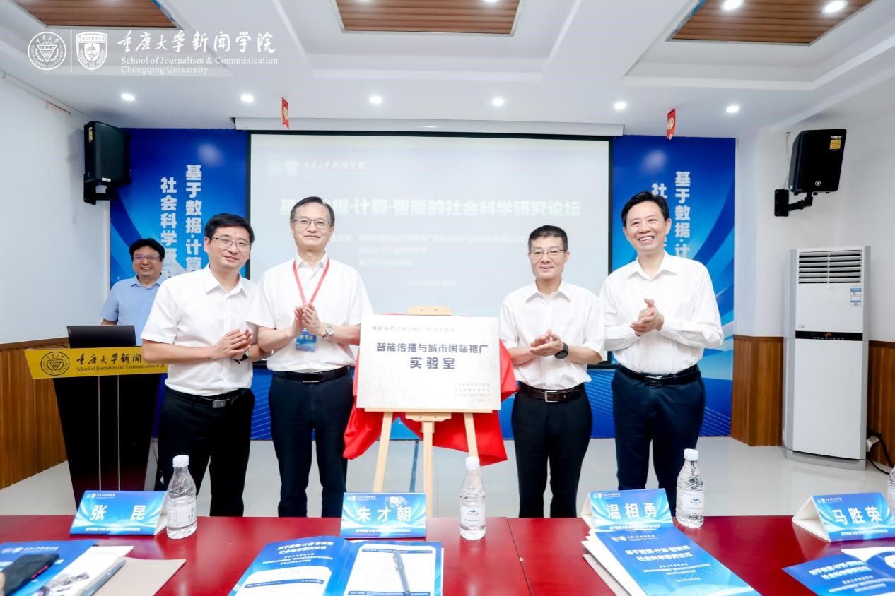 领导致辞后,“智能传播与城市国际推广实验室”举行揭牌仪式。朱才朝、温相勇、郭小安、董天策等共同为“智能传播与城市国际推广实验室”揭牌。