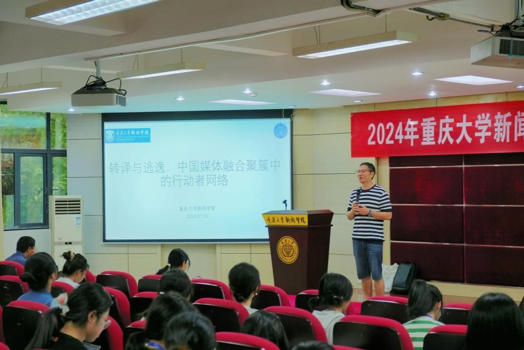 张小强教授作了题为“转译与逃逸:中国媒体融合聚簇中的行动者网络”的讲座,用行动者网络理论对媒体融合进行解读。他提到行动者网络理论可以用来“重组”(描述)社会,自然可以应用于“重组”新闻业,在这一理论视域下,新闻简言之就是一个由异质行动者装配在一起的网络。他指出当前我国媒体融合行动者网络存在不稳定的特点,该网络可能对外部行动者吸引力不足。他还向同学们赠送了自己的原创科幻小说《盖亚的终极算法》。