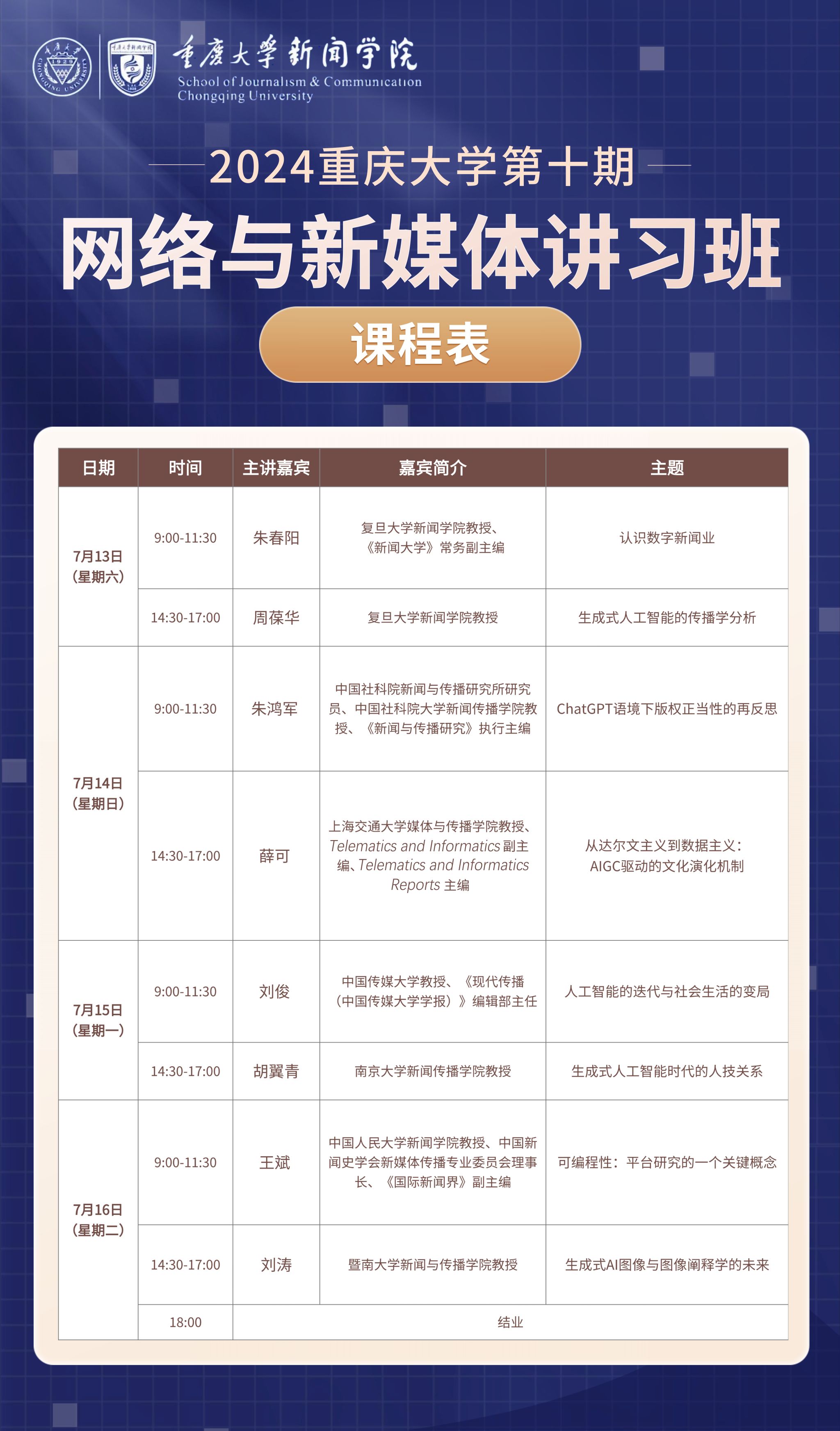 海棠搜书 2024第十期网络与新媒体讲习班学员名单已通过回复报名邮件的方式公布,请及时查看。如未收到,请特别查看垃圾邮件信箱等。讲习班课表如下,请各位学员按时参加研习。