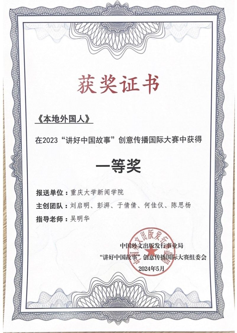 吴明华副教授指导的作品“本地外国人”荣获2023年“讲好中国故事”创意传播国际大赛全国一等奖。