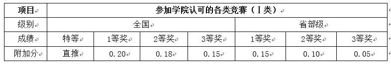 1.学校鼓励学生参加学科竞赛、创新评优等活动,并对其所获得的成果实行奖励加分,奖励分值按学院推免生遴选工作细则的规定执行;但奖励加分不得超过0.4分。细则中没有的重要国家级竞赛奖励由推免研究生工作小组认定。